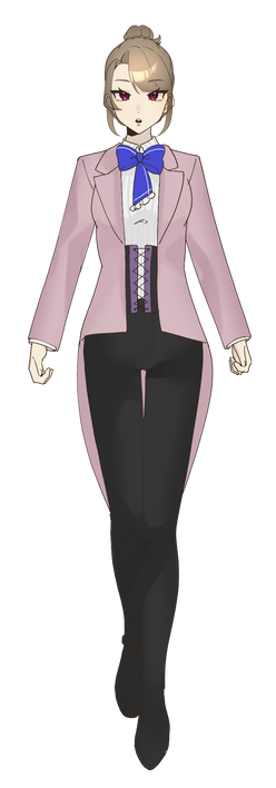 服装:ブラウスにコルセット、パンツスタイルが基本。現在は小豆色のループタイを着け、マントを肩にかけている